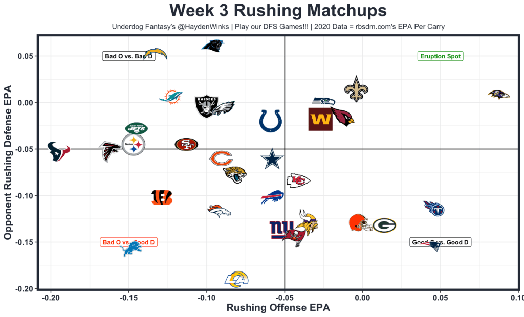Sometimes in DFS, you have to talk yourself into a play and other times it takes no effort at all. As you can see in Hayden Winks graphic, the Ravens running game is primed for an explosion against this poor Lions defence that are ill-equipped to face them. The Ravens lead the league in rushing yards per game with a huge 220. The Lions have allowed two RB2 or better performances already and Ty’Son Williams could be primed for a big day. Despite fumbling the ball early against the Chiefs the Ravens continued to use him as the lead back, out-touching Latavius Murray and having two targets to Murray’s zero.