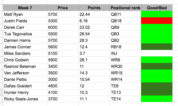 Quarterbacks went exceptionally (aside from Justin Fields), with Matt Ryan (QB11), Derek Carr (QB9) and Tua (QB3), all putting up top 12 performances and returning solid points. At running back Damien Harris was the RB2 of the slate with a 5x dollar/points ratio. James Conner was a bit of a letdown against Houston, but still, put up 12.4 points. At receiver, we ran nicely with Godwin, Bateman, Van Jefferson and Pettis all doing well. Tight end wasn’t as explosive as in week 6 but Goedert (TE8), Henry (TE13) and Ricky Seals-Jones (TE14) all did just about enough to keep your team ticking over.